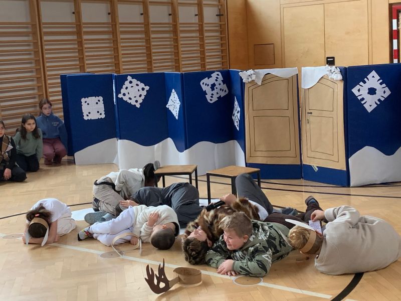 Die Kinder der Theatergruppe führen ihr einstudiertes Stück auf.